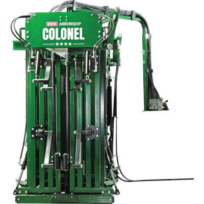 The Colonel comes standard with the features you need and will use, including a unique 3-way squeeze and live floor, high-quality construction with massive 5/8 top gussets and 3/8 bottom gussets for maximum strength, hydraulic neck extenders for total head control, and multiple safe access points.